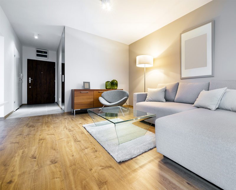 The gracious entry foyer leads to an open kitchen with custom stained walnut cabinetry, granite countertops, and a built-in dining banquette (in select one bedroom homes).